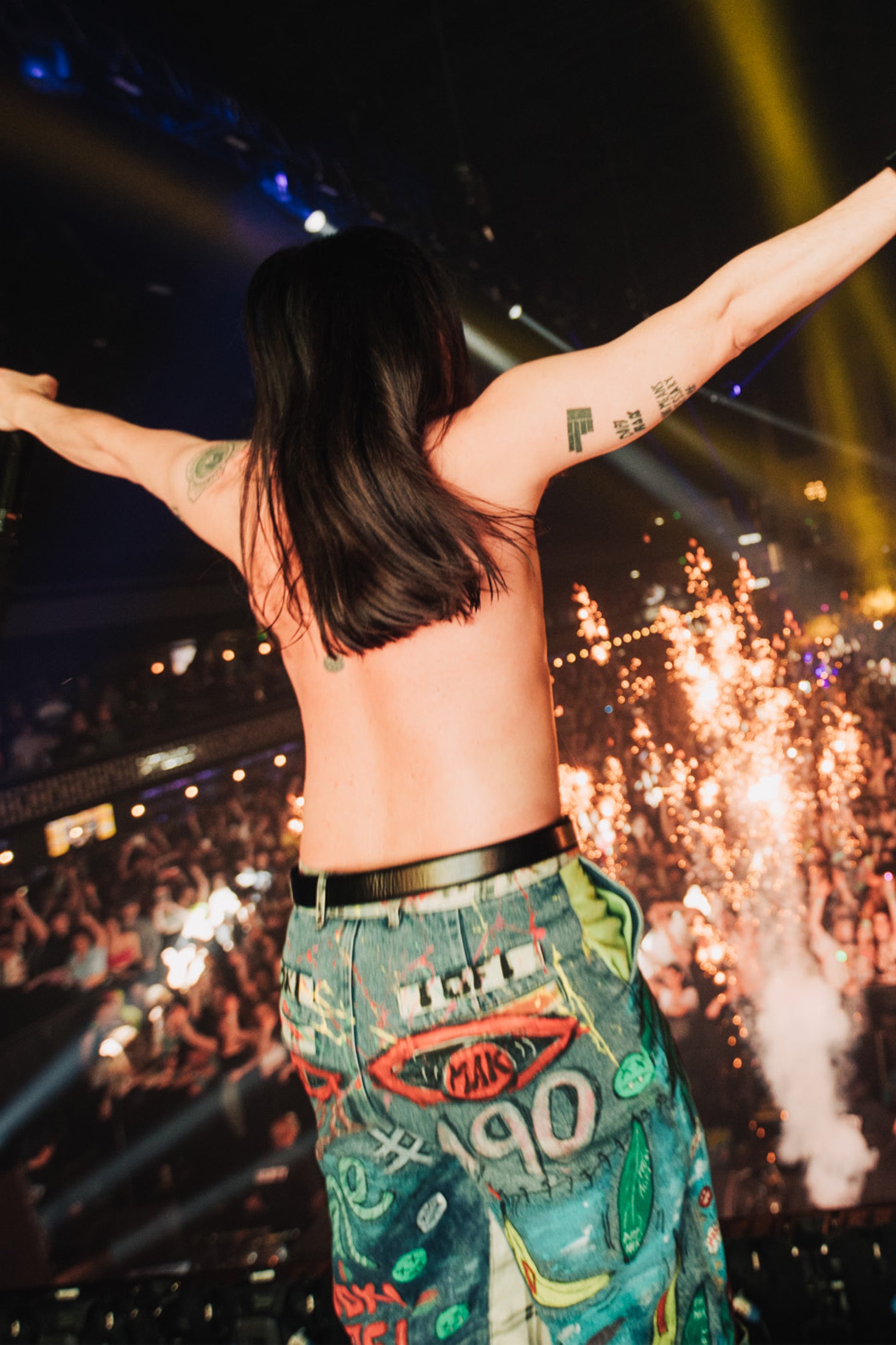 This authenticated, numbered, and collectible one-of-one painted and patched denim jeans was personally customized by Steve Aoki, the Dim Mak Design Team, and/or collaborators using repurposed garments, materials, or parts.